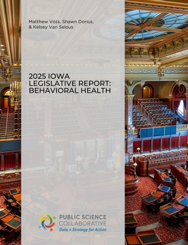 Iowa State University's Public Science Collaborative created a variety of resources to help navigate the landscape of behavioral health in Iowa. See our Behavioral Health Policy Tracker below to stay abreast of upcoming policies in Iowa, or reference our Iowa Legislative Advocacy Toolkit, 2025 Iowa Legislative Behavioral Health Report, or Advocacy Resource Library.