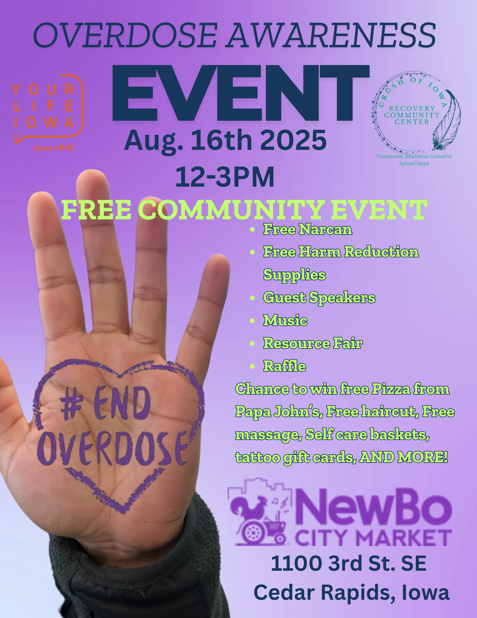 On August 19th, join CRUSH of Iowa for their free overdose awareness event! Resources will include Naloxone training, speakers, and more!